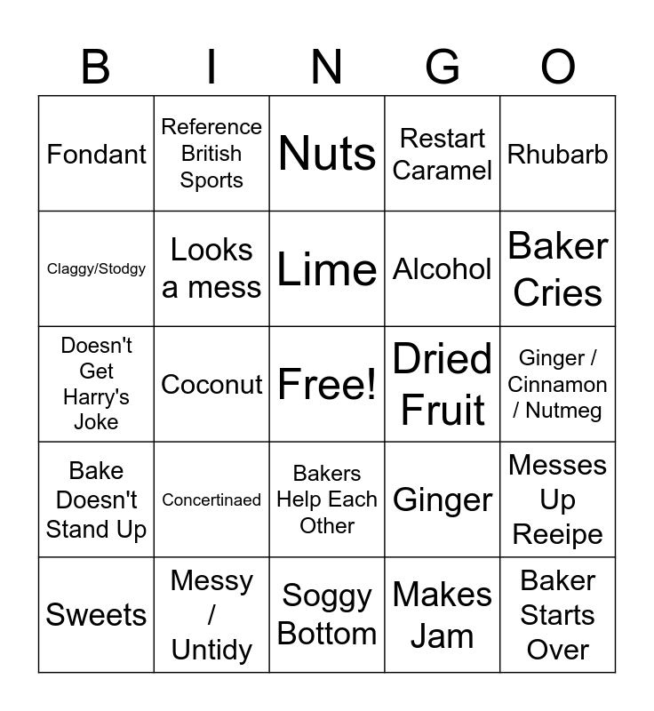 This bingo card has a free space and 48 words: Hollywood Handshake, Baker Starts Over, Under/Overproved, Soggy Bottom, Concertinaed, Adult joke made, Reference British Sports, Floral, Claggy/Stodgy, Under/Over Baked, Looks a mess, Restart Caramel, Messes Up Reeipe, Ginger, Orange, Lemon, Lime, Dried Fruit, Passion Fruit, Rhubarb, Coconut, Makes Jam, Fondant, Alcohol, Baker Starts Over, Baker Cries, Sweets, Dropped Bake, Bakers Help Each Other, Bake Doesn't Stand Up, Restart Caramel, Reference British Sports, Reference British celebrity, Under/Over Baked, Messy / Untidy, Measures Incorrectly, Forgets an ingredient, Ginger / Cinnamon / Nutmeg, Orange, Lemon, Lime, Dried Fruit, Nuts, Fondant, Doesn't Get Harry's Joke, Makes Jam / Jelly, Surprised It's Good and Floral/Herbs.