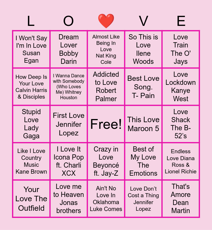 This bingo card has a free space and 86 words: Love Story Taylor Swift, Bleeding Love Leona Lewis, Crazy in Love Beyoncé ft. Jay-Z, Love Me Like You Do Ellie Goulding, I Will Always Love You Whitney Houston, All You Need Is Love The Beatles, Love on Top Beyoncé, Can’t Help Falling in Love Elvis Presley, Vision of Love Mariah Carey, We Found Love Rihanna ft. Calvin Harris, The Power of Love Celine Dion, The power of love Huey Lewis and the News, Endless Love Diana Ross & Lionel Richie, Love Shack The B-52’s, Love Me Do The Beatles, Addicted to Love Robert Palmer, Lovefool The Cardigans, Love Is A Open Door Kristen Bell, Love is a Battlefield Pat Benatar, Love Is A Cowboy Kelsey Ballerini, Love You Like a Love Song Selena Gomez & The Scene, L-O-V-E Nat King Cole, Stupid Love Lady Gaga, Love on the Brain Rihanna, Love Don’t Cost a Thing Jennifer Lopez, Love Again Dua Lipa, Love in This Club Usher ft. Young Jeezy, She Will Be Loved Maroon 5, Love Song Sara Bareilles, I Love Rock ’n’ Roll Joan Jett & the Blackhearts, Love me to Heaven Jonas brothers, Somebody to Love Queen, Somebody to Love Justin Bieber, I Love It Icona Pop ft. Charli XCX, How Deep Is Your Love Calvin Harris & Disciples, How Deep Is Your Love Bee Gees, Love Lockdown Kanye West, Love and Marriage Frank Sinatra, how sweet it is to be loved by you James Tayler, First Love Jennifer Lopez, Puppy Love Paul anka, Love Bites Def Leppard, What lovers do Maroon 5 & SZA, This Love Maroon 5, To Love Somebody Michael Buble, Love Train The O' Jays, This Will Be(An Everlasting Love) Natalie Cole, Dream Lover Bobby Darin, Love You Like I UsedTo Russell Dickerson, I Can't Love You Any More Mitchell Tenpenny, This Everyday Love Rasscal Flatts, Lover Tayler Swift, Like I Love Country Music Kane Brown, Lovebug Jonas Brothers, International Love Pitbull & Chris Brown, DJ Got Us Fallin' In Love Usher & Pitbull, Lay All Your Love On Me Dominic Cooper, Best Love Song. T- Pain, So This is Love Ilene Woods, I Wanna Dance with Somebody (Who Loves Me) Whitney Houston, I Won't Say I'm In Love Susan Egan, Stop! In The Name Of Love The Supremes, He Loves U Not Dream, Crazy Love Michael Buble, Dont Be Stupid (You Know I Love You) Shania Twain, Almost Like Being In Love Nat King Cole, Love Like That Tiffany Houhton, That's Amore Dean Martin, She's In Love The Little Mermaid: Original Broadway Cast, She's In Love With The Boy Trisha Yearwood, The Way You Love Me Faith Hill, Love You Out Loud Rascal Flats, Your Love The Outfield, Let Me Love You Justin Bieber, Let Me Love You Ne-o, I Want Know What Love Is Foreigner, Ain't No Love In Oklahoma Luke Comes, Stone in Love Journey, Crazy Little Thing Called Love Queen, Time Is Love Josh Turner, Higher & Higher ( Your Love Keeps Lifting ) Jackie Wilson, What's Love Got to Do with It Tina Turner, Come and Get Your Love Redbone, You Can't Hurry Love The Supremes, Best of My Love The Emotions and Fool Around and Fell In Love Elvin bishop.
