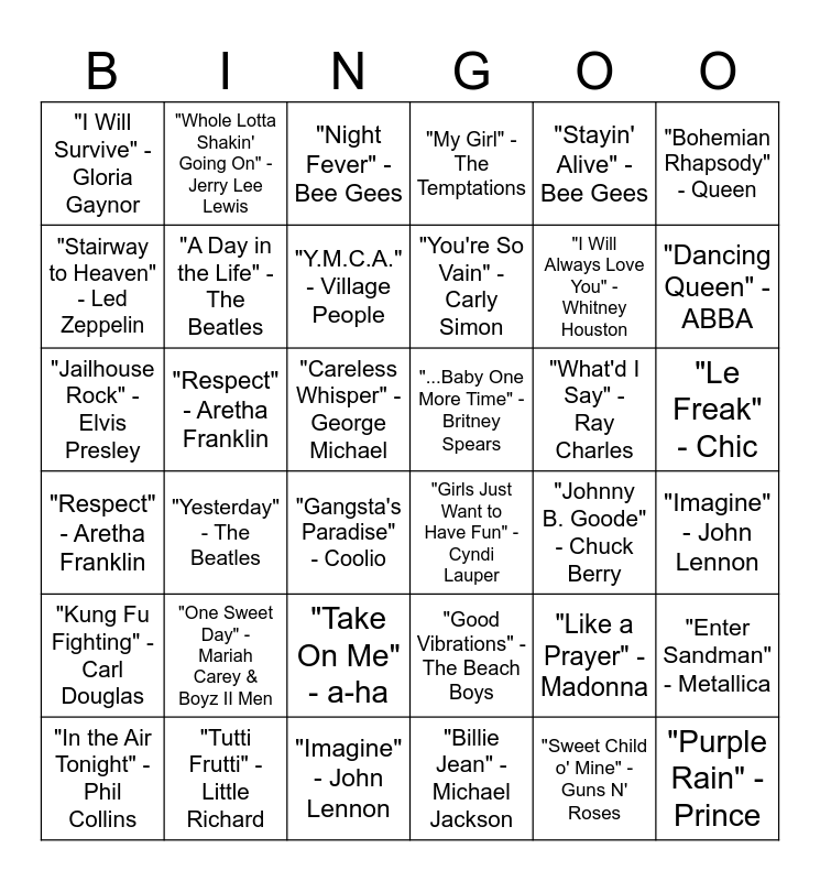 This bingo card has 50 words: "Rock Around the Clock" - Bill Haley & His Comets, "Jailhouse Rock" - Elvis Presley, "Hound Dog" - Elvis Presley, "Johnny B. Goode" - Chuck Berry, "What'd I Say" - Ray Charles, "Tutti Frutti" - Little Richard, "Whole Lotta Shakin' Going On" - Jerry Lee Lewis, "Summertime Blues" - Eddie Cochran, "Bohemian Rhapsody" - Queen, "Imagine" - John Lennon, "Stairway to Heaven" - Led Zeppelin, "My Girl" - The Temptations, "Yesterday" - The Beatles, "Respect" - Aretha Franklin, "Like a Rolling Stone" - Bob Dylan, "Good Vibrations" - The Beach Boys, "A Day in the Life" - The Beatles, "Respect" - Aretha Franklin, "California Dreamin'" - The Mamas & The Papas, "Stayin' Alive" - Bee Gees, "Dancing Queen" - ABBA, "Imagine" - John Lennon, "I Will Survive" - Gloria Gaynor, "Y.M.C.A." - Village People, "Let's All Chant" - Michael Zager Band, "Kung Fu Fighting" - Carl Douglas, "You're So Vain" - Carly Simon, "Take It Easy" - Eagles, "Night Fever" - Bee Gees, "Le Freak" - Chic, "Thriller" - Michael Jackson, "Like a Prayer" - Madonna, "Livin' on a Prayer" - Bon Jovi, "Every Breath You Take" - The Police, "Girls Just Want to Have Fun" - Cyndi Lauper, "Take On Me" - a-ha, "Billie Jean" - Michael Jackson, "Sweet Child o' Mine" - Guns N' Roses, "Purple Rain" - Prince, "Careless Whisper" - George Michael, "In the Air Tonight" - Phil Collins, "Smells Like Teen Spirit" - Nirvana, "Enter Sandman" - Metallica, "Waterfalls" - TLC, "Gangsta's Paradise" - Coolio, "I Will Always Love You" - Whitney Houston, "One Sweet Day" - Mariah Carey & Boyz II Men, "Wannabe" - Spice Girls, "...Baby One More Time" - Britney Spears and "No Scrubs" - TLC.