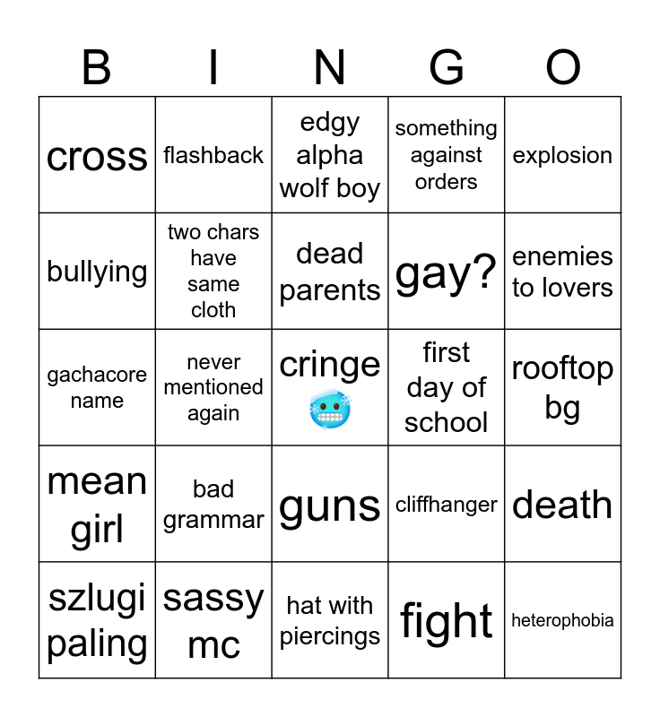 This bingo card has a free space and 24 words: bad grammar, sassy mc, dead parents, szlugi paling, explosion, cross, bullying, flashback, first day of school, guns, gay?, gachacore name, cliffhanger, death, two chars have same cloth, fight, rooftop bg, edgy alpha wolf boy, enemies to lovers, never mentioned again, heterophobia, mean girl, something against orders and hat with piercings.