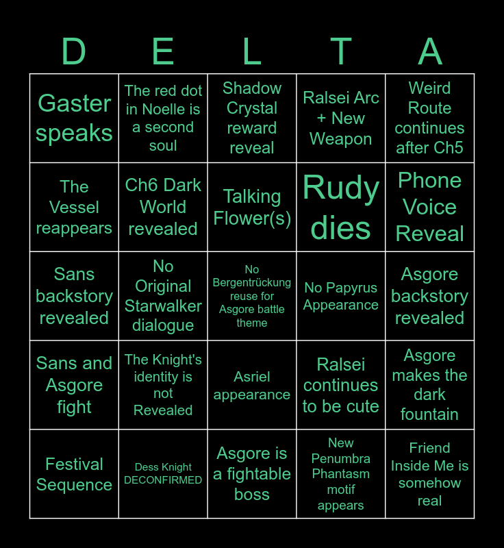 This bingo card has 25 words: The Knight's identity is not Revealed, Asgore is a fightable boss, Talking Flower(s), Festival Sequence, Weird Route continues after Ch5, Gaster speaks, The Vessel reappears, The red dot in Noelle is a second soul, No Papyrus Appearance, Asriel appearance, Rudy dies, Sans backstory revealed, Ralsei continues to be cute, Asgore makes the dark fountain, Ch6 Dark World revealed, Friend Inside Me is somehow real, Asgore backstory revealed, Shadow Crystal reward reveal, Phone Voice Reveal, No Original Starwalker dialogue, No Bergentrückung reuse for Asgore battle theme, Dess Knight DECONFIRMED, Sans and Asgore fight, Ralsei Arc + New Weapon and New Penumbra Phantasm motif appears.