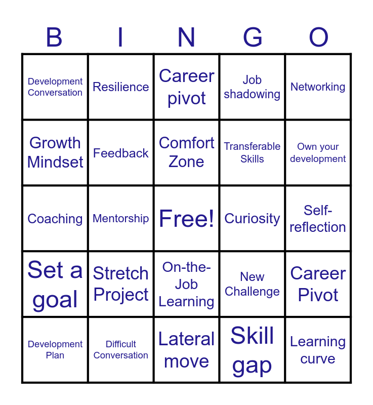 This bingo card has a free space and 24 words: Stretch Project, Difficult Conversation, Comfort Zone, Development Plan, Networking, Development Conversation, Growth Mindset, Resilience, Curiosity, On-the-Job Learning, Transferable Skills, Coaching, New Challenge, Career Pivot, Feedback, Skill gap, Self-reflection, Career pivot, Own your development, Mentorship, Learning curve, Set a goal, Job shadowing and Lateral move.