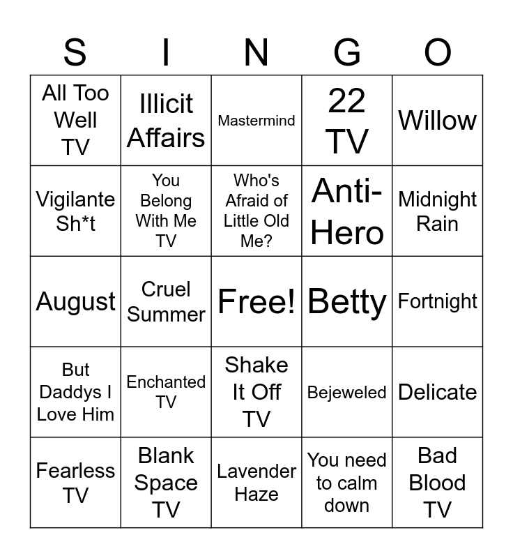 This bingo card has a free space and 43 words: Miss American & Heartbreak prince, Cruel Summer, The man, You need to calm down, So High School, Fearless TV, You Belong With Me TV, Karma, 22 TV, We Are Never Getting Back Together TV, All Too Well TV, Enchanted TV, Bejeweled, Delicate, The Smallest Man Who Ever Lived, Marjorie, Cardigan, Betty, Champagne, August, Illicit Affairs, My Tears Ricochet, Look What you made me do, Willow, Style TV, Blank Space TV, Shake It Off TV, Wildest Dreams TV, Bad Blood TV, But Daddys I Love Him, So High School, Who's Afraid of Little Old Me?, Down Bad, Fortnight, The Smallest Man Who Ever Lived, I Can Do It With A Broken Heart, Lavender Haze, Anti-Hero, Midnight Rain, Vigilante Sh*t, Bejeweled, Mastermind and Karma.