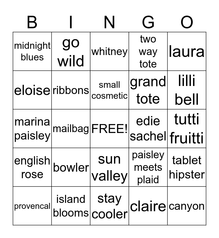 This bingo card has a free space and 24 words: bowler, island blooms, small cosmetic, provencal, laura, midnight blues, eloise, go wild, edie sachel, sun valley, grand tote, marina paisley, paisley meets plaid, tablet hipster, ribbons, claire, tutti fruitti, whitney, lilli bell, mailbag, canyon, english rose, two way tote and stay cooler.