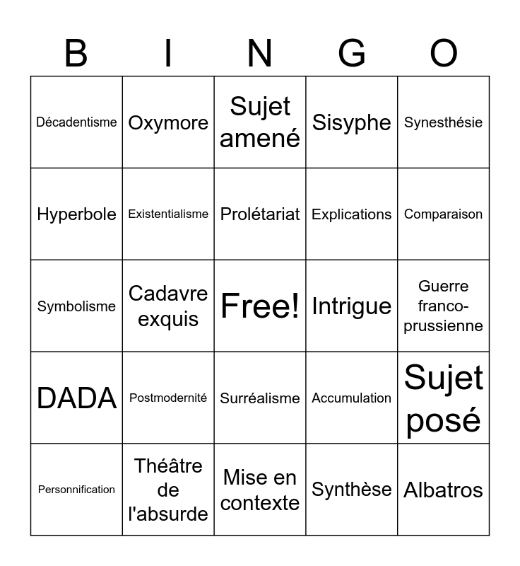 This bingo card has a free space and 41 words: Psychanalyse, Symbolisme, Réalisme, Existentialisme, Théâtre de l'absurde, Surréalisme, Prolétariat, Bourgeoisie, Synesthésie, DADA, Cadavre exquis, Sisyphe, Albatros, Guerre franco-prussienne, Intrigue, Postmodernité, Moderne, Décadentisme, Hybridité, Sujet amené, Sujet posé, Sujet divisé, Mise en contexte, Explications, Conclusion partielle, Rappel, Synthèse, Ouverture, Comparaison, Métaphore, Antithèse, Oxymore, Personnification, Gradation, Accumulation, Hyperbole, Euphémisme, Litote, Anaphore, Répétition and Périphrase.