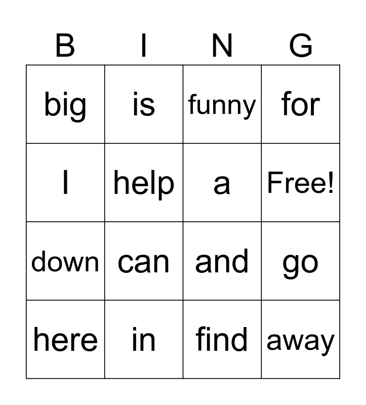 This bingo card has 17 words: find, here, funny, big, can, for, go, a, Free!, help, in, and, I, is, down, come and away.