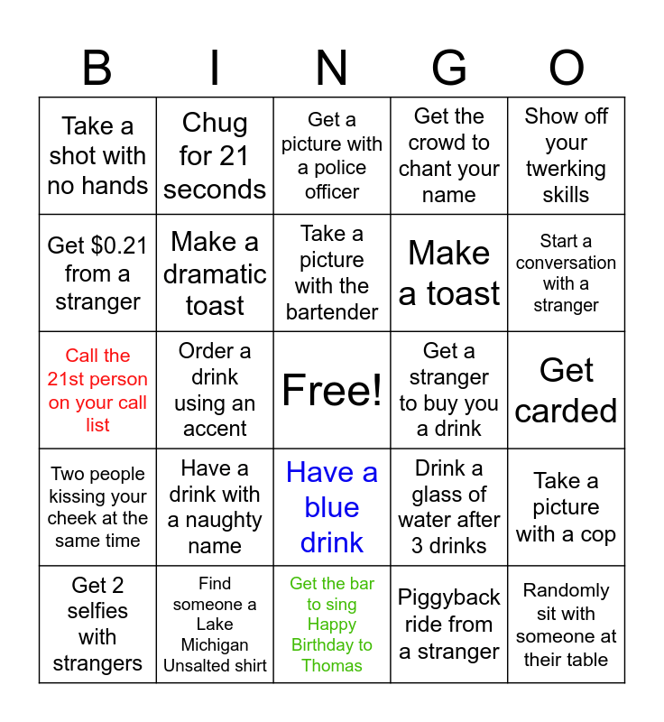 This bingo card has a free space and 29 words: Get 2 selfies with strangers, Dance on a stage/bar, Order a drink using an accent, Take a picture with a live musician, Take a shot with no hands, Get a picture with a police officer, Make a dramatic toast, Have a drink with a naughty name, Get a stranger to buy you a drink, Find someone a Lake Michigan Unsalted shirt, Get carded, Randomly sit with someone at their table, Get the bar to sing Happy Birthday to Thomas, Piggyback ride from a stranger, Start a conversation with a stranger, Take a shot with Thomas, Have a blue drink, Two people kissing your cheek at the same time, Show off your twerking skills, Call the 21st person on your call list, Drink a glass of water after 3 drinks, Sing the Ole Miss Hotty Toddy Cheer, Make a toast, Get $0.21 from a stranger, Get the crowd to chant your name, Chug for 21 seconds, Take a picture with a cop, Take a picture with the bartender and Take a birthday cake shot.