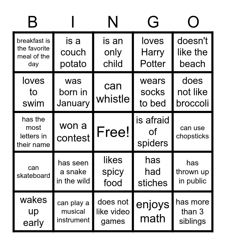This bingo card has a free space and 24 words: has seen a snake in the wild, can play a musical instrument, can whistle, wakes up early, doesn't like the beach, breakfast is the favorite meal of the day, loves to swim, is a couch potato, is afraid of spiders, likes spicy food, wears socks to bed, has the most letters in their name, has had stiches, has thrown up in public, was born in January, enjoys math, can use chopsticks, is an only child, does not like broccoli, won a contest, has more than 3 siblings, can skateboard, loves Harry Potter and does not like video games.