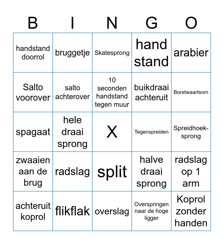 This bingo card has a free space and 24 words: radslag, flikflak, 10 seconden handstand tegen muur, achteruit koprol, arabier, handstand doorrol, Salto voorover, bruggetje, Tegenspreiden, split, buikdraai achteruit, spagaat, halve draai sprong, radslag op 1 arm, salto achterover, Overspringen naar de hoge ligger, Spreidhoek-sprong, Skatesprong, Borstwaartsom, hele draai sprong, Koprol zonder handen, zwaaien aan de brug, hand stand and overslag.