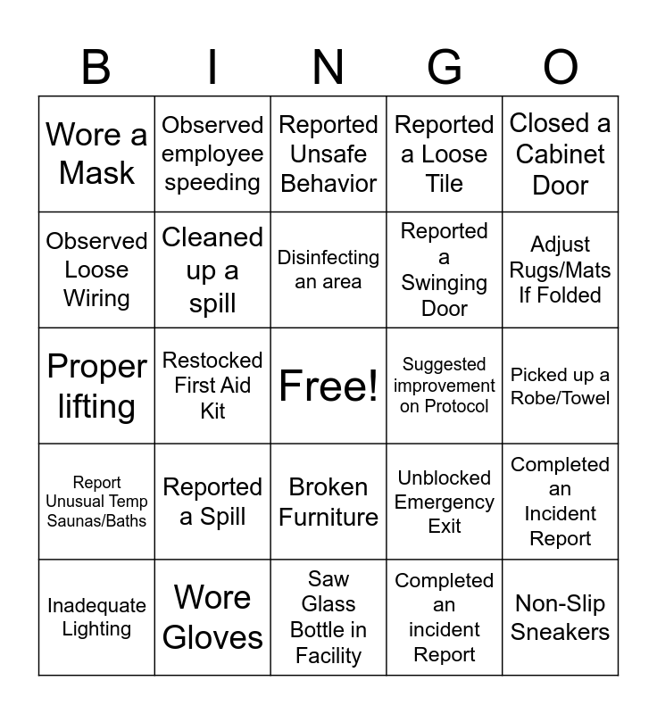 This bingo card has a free space and 24 words: Reported a Spill, Wore Gloves, Disinfecting an area, Inadequate Lighting, Closed a Cabinet Door, Wore a Mask, Observed Loose Wiring, Observed employee speeding, Suggested improvement on Protocol, Broken Furniture, Reported a Swinging Door, Proper lifting, Unblocked Emergency Exit, Completed an Incident Report, Cleaned up a spill, Completed an incident Report, Picked up a Robe/Towel, Reported Unsafe Behavior, Adjust Rugs/Mats If Folded, Restocked First Aid Kit, Non-Slip Sneakers, Report Unusual Temp Saunas/Baths, Reported a Loose Tile and Saw Glass Bottle in Facility.