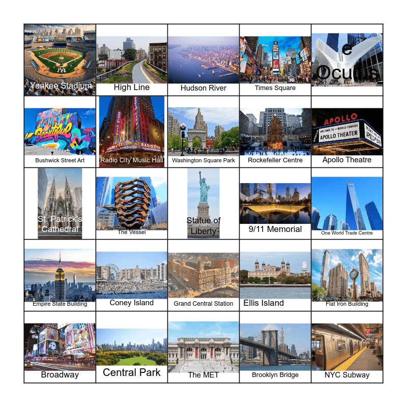 This bingo card has 25 images and 25 words: Coney Island, The MET, Washington Square Park, Broadway, e Oculus, Yankee Stadium, Bushwick Street Art, High Line, 9/11 Memorial, Grand Central Station, Rockefeller Centre, St. Patrick's Cathedral, Ellis Island, Flat Iron Building, Radio City Music Hall, NYC Subway, One World Trade Centre, Hudson River, Apollo Theatre, The Vessel, Statue of Liberty, Central Park, Empire State Building, Times Square and Brooklyn Bridge.