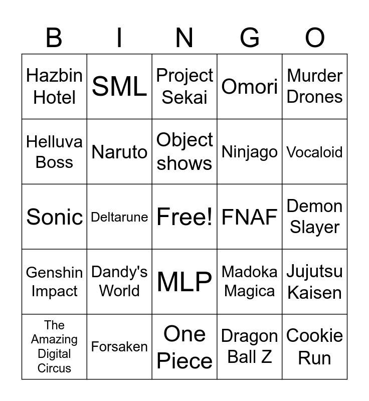 This bingo card has a free space and 24 words: Dandy's World, Forsaken, Object shows, The Amazing Digital Circus, Murder Drones, Hazbin Hotel, Helluva Boss, SML, FNAF, MLP, Ninjago, Sonic, Madoka Magica, Jujutsu Kaisen, Naruto, Dragon Ball Z, Demon Slayer, Project Sekai, Vocaloid, Deltarune, Cookie Run, Genshin Impact, Omori and One Piece.