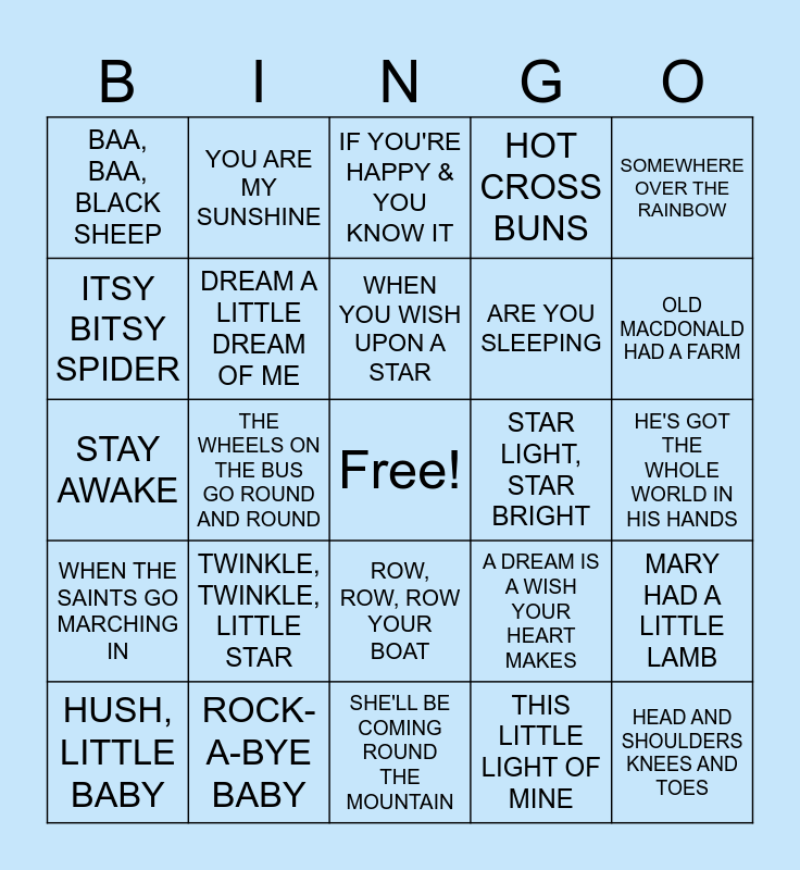 This bingo card has a free space and 24 words: TWINKLE, TWINKLE, LITTLE STAR, ROCK-A-BYE BABY, WHEN YOU WISH UPON A STAR, HUSH, LITTLE BABY, SOMEWHERE OVER THE RAINBOW, BAA, BAA, BLACK SHEEP, ITSY BITSY SPIDER, YOU ARE MY SUNSHINE, STAR LIGHT, STAR BRIGHT, ROW, ROW, ROW YOUR BOAT, ARE YOU SLEEPING, STAY AWAKE, A DREAM IS A WISH YOUR HEART MAKES, MARY HAD A LITTLE LAMB, DREAM A LITTLE DREAM OF ME, THIS LITTLE LIGHT OF MINE, HE'S GOT THE WHOLE WORLD IN HIS HANDS, IF YOU'RE HAPPY & YOU KNOW IT, OLD MACDONALD HAD A FARM, THE WHEELS ON THE BUS GO ROUND AND ROUND, HEAD AND SHOULDERS KNEES AND TOES, WHEN THE SAINTS GO MARCHING IN, HOT CROSS BUNS and SHE'LL BE COMING ROUND THE MOUNTAIN.