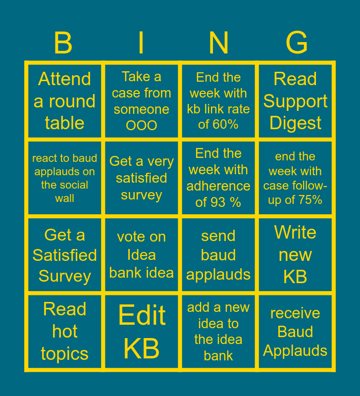 This bingo card has 16 words: Edit KB, Write new KB, End the week with kb link rate of 60%, Attend a round table, Get a Satisfied Survey, Take a case from someone OOO, send baud applauds, add a new idea to the idea bank, react to baud applauds on the social wall, Get a very satisfied survey, Read hot topics, Read Support Digest, vote on Idea bank idea, end the week with case follow-up of 75%, End the week with adherence of 93 % and receive Baud Applauds.
