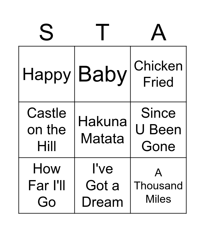 This bingo card has 37 words: Free!, We Don't Talk About Bruno, Un Poco Loco, How Far I'll Go, Let It Go, Dig a Little Deeper, I've Got a Dream, Under the Sea, Hakuna Matata, Breaking Free, Space Jam, Castle on the Hill, September, Bye Bye Bye, Since U Been Gone, Irreplaceable, Party in the USA, Chicken Fried, You Belong With Me, Burnin' Up, Happy, Call Me Maybe, What Makes You Beautiful, Firework, a thousand years, Drag Me Down, Baby, Look Up Child, I Could Sing of Your Love, Be Thou My Vision, I Thank God, Say Yes, I Want You Back, Stargazing, clouds, A Thousand Miles and Dancing Queen.