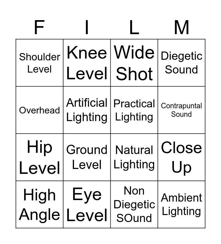 This bingo card has 20 words: Close Up, Medium Shot, Wide Shot, Low Angle, High Angle, Overhead, Eye Level, Shoulder Level, Hip Level, Knee Level, Ground Level, Natural Lighting, Artificial Lighting, Ambient Lighting, Practical Lighting, Synchronized Sound, Contrapuntal Sound, Diegetic Sound, Non Diegetic SOund and Light Motif.