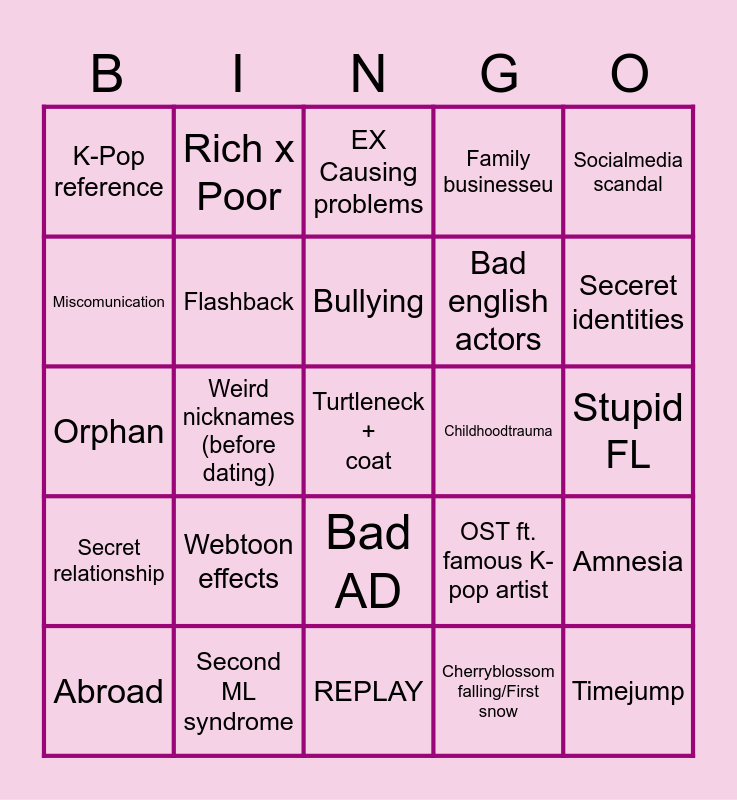 This bingo card has a free space and 28 words: Amnesia, Car crash, Bad english actors, Cherryblossom falling/First snow, Miscomunication, EX Causing problems, Rich x Poor, Secret relationship, Childhoodtrauma, Abroad, Orphan, Family businesseu, Second ML syndrome, REPLAY, Seceret identities, Slowmotion, Webtoon effects, Flashback, Bullying, Bad AD, K-Pop reference, drunk confession, Timejump, Weird nicknames (before dating), Stupid FL, OST ft. famous K-pop artist, Socialmedia scandal and KDrama magic.