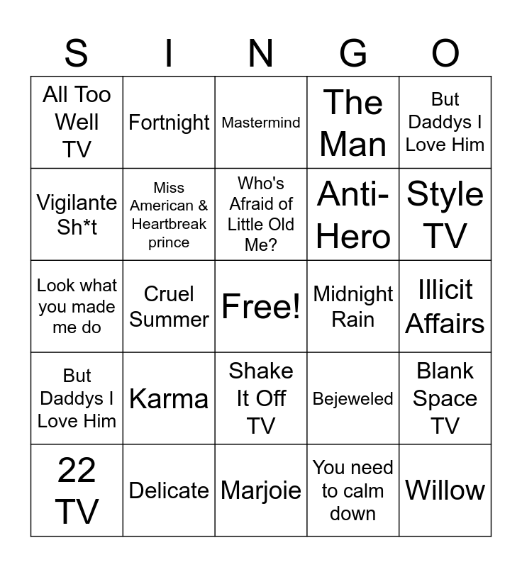 This bingo card has a free space and 43 words: The smallest man who ever lived, Cruel Summer, Fearless, You need to calm down, Cardigan, 22 TV, Miss American & Heartbreak prince, Betty, The Man, We Are Never Getting Back Together TV, All Too Well TV, Karma, Bejeweled, Blank Space TV, Bejeweled, Lavender Haze, Delicate, Midnight Rain, Champagne, Look what you made me do, Fortnight, My Tears Ricochet, So Long High School, But Daddys I Love Him, Bad Blood TV, Delicate, Shake It Off TV, Wildest Dreams TV, Willow, But Daddys I Love Him, So High School, Who's Afraid of Little Old Me?, Down Bad, Illicit Affairs, The Smallest Man Who Ever Lived, I Can Do It With A Broken Heart, Marjoie, Anti-Hero, Style TV, Vigilante Sh*t, August, Mastermind and Karma.