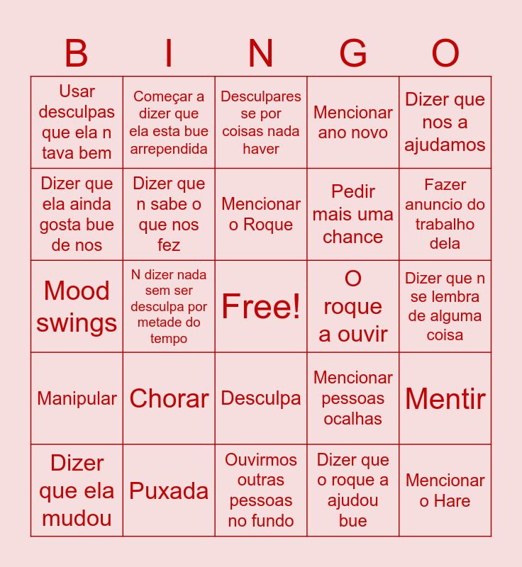 This bingo card has a free space and 24 words: Chorar, Puxada, Mencionar o Roque, Dizer que ela mudou, Dizer que nos a ajudamos, Usar desculpas que ela n tava bem, Dizer que ela ainda gosta bue de nos, Começar a dizer que ela esta bue arrependida, O roque a ouvir, Desculpa, Pedir mais uma chance, Mood swings, Mencionar pessoas ocalhas, Mentir, Dizer que n sabe o que nos fez, Dizer que o roque a ajudou bue, Dizer que n se lembra de alguma coisa, Desculpares se por coisas nada haver, Fazer anuncio do trabalho dela, N dizer nada sem ser desculpa por metade do tempo, Mencionar o Hare, Manipular, Mencionar ano novo and Ouvirmos outras pessoas no fundo.