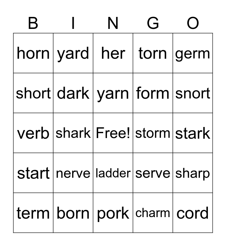 This bingo card has a free space and 32 words: charm, march, shark, cart, start, dark, germ, sharp, yard, farm, yarn, her, fern, perk, storm, stern, term, verb, ladder, nerve, serve, corn, stark, born, cord, torn, form, short, horn, pork, perch and snort.