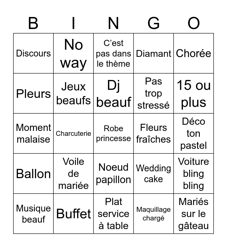 This bingo card has a free space and 24 words: Voile de mariée, Buffet, Dj beauf, Musique beauf, Chorée, Discours, Pleurs, No way, Fleurs fraîches, Noeud papillon, Pas trop stressé, Moment malaise, Wedding cake, Voiture bling bling, Jeux beaufs, Maquillage chargé, Déco ton pastel, C’est pas dans le thème, 15 ou plus, Charcuterie, Mariés sur le gâteau, Ballon, Diamant and Plat service à table.