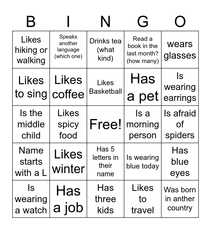 This bingo card has a free space and 24 words: Likes winter, Has a job, Likes Basketball, Is wearing a watch, wears glasses, Likes hiking or walking, Likes to sing, Speaks another language (which one), Is a morning person, Has 5 letters in their name, Has a pet, Is the middle child, Is wearing blue today, Has blue eyes, Likes coffee, Likes to travel, Is afraid of spiders, Drinks tea (what kind), Is wearing earrings, Likes spicy food, Was born in anther country, Name starts with a L, Read a book in the last month? (how many) and Has three kids.