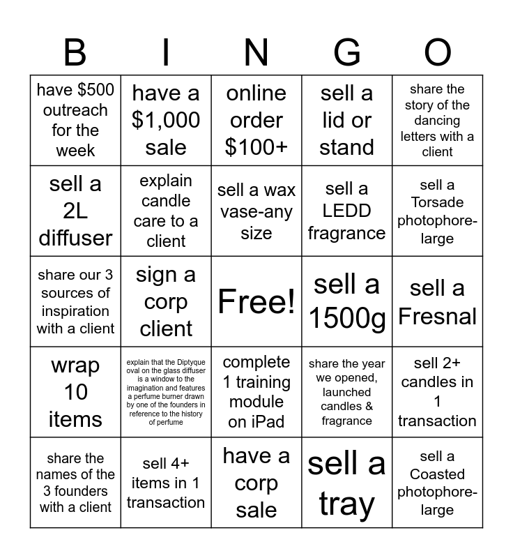 This bingo card has a free space and 24 words: explain that the Diptyque oval on the glass diffuser is a window to the imagination and features a perfume burner drawn by one of the founders in reference to the history of perfume, sell 4+ items in 1 transaction, sell a wax vase-any size, share the names of the 3 founders with a client, share the story of the dancing letters with a client, have $500 outreach for the week, sell a 2L diffuser, have a $1,000 sale, sell a 1500g, complete 1 training module on iPad, sell a LEDD fragrance, share our 3 sources of inspiration with a client, share the year we opened, launched candles & fragrance, sell 2+ candles in 1 transaction, explain candle care to a client, sell a tray, sell a Fresnal, online order $100+, sell a Torsade photophore-large, sign a corp client, sell a Coasted photophore-large, wrap 10 items, sell a lid or stand and have a corp sale.