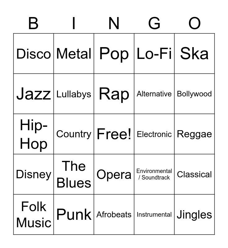 This bingo card has a free space and 28 words: Classical, Dance, Alternative, Instrumental, Jazz, Pop, Metal, Disney, Electronic, Folk Music, Hip-Hop, Lo-Fi, Punk, Afrobeats, Bollywood, Salsa, The Blues, Lullabys, Rap, Opera, Disco, R&B/Soul, Jingles, Country, Reggae, Environmental / Soundtrack, Ska and Rock n Roll.
