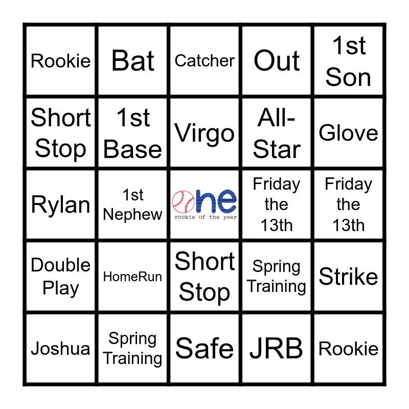 This bingo card has a free space and 50 words: JRB, Rookie, All-Star, Safe, HomeRun, Glove, Bat, Catcher, Short Stop, Runner, 1st Base, Out, Strike, Spring Training, Season Tickets, September Baby, Virgo, Friday the 13th, 1st Grandbaby, 1st Son, 1st Nephew, JRB, Rookie, All-Star, Safe, Home Run, Glove, Bat, Catcher, Short Stop, Runner, 1st Base, Out, Strike, Spring Training, Season Tickets, September Baby, Fall, Virgo, Friday the 13th, 1st Grandbaby, 1st Son, 1st Nephew, Banks, Joshua, Rylan, Ball, Grand Slam, Double Play and Bases Loaded.
