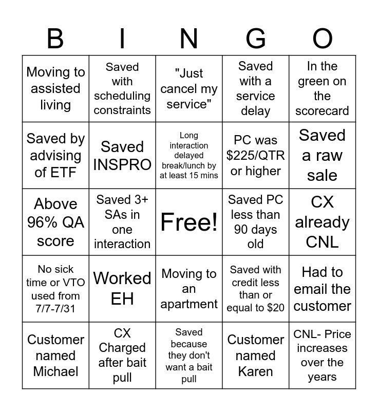 This bingo card has a free space and 29 words: Customer named Michael, Worked SA from the 90s or older, Saved 3+ SAs in one interaction, Participated in 2 Culture Keeper activities, Moving to assisted living, "Just cancel my service", Saved INSPRO, Worked EH, Saved PC less than 90 days old, CX Charged after bait pull, CX already CNL, CNL- Price increases over the years, Saved because they don't want a bait pull, Customer named Karen, Saved a raw sale, Scheduled CTV for a move, Moving to an apartment, No sick time or VTO used from 7/7-7/31, In the green on the scorecard, Above 96% QA score, Saved with credit less than or equal to $20, CX was saved previously (less than 9 months ago), PC was $225/QTR or higher, Saved by advising of ETF, Saved with a service delay, Saved with scheduling constraints, Had to email the customer, Long interaction delayed break/lunch by at least 15 mins and "It's illegal to make the CNL process difficult".