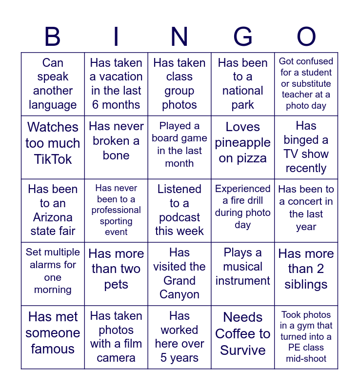 This bingo card has 25 words: Has more than two pets, Has worked here over 5 years, Played a board game in the last month, Has met someone famous, Got confused for a student or substitute teacher at a photo day, Can speak another language, Watches too much TikTok, Has taken a vacation in the last 6 months, Experienced a fire drill during photo day, Has visited the Grand Canyon, Loves pineapple on pizza, Has been to an Arizona state fair, Plays a musical instrument, Has more than 2 siblings, Has never broken a bone, Took photos in a gym that turned into a PE class mid-shoot, Has been to a concert in the last year, Has taken class group photos, Has binged a TV show recently, Has never been to a professional sporting event, Listened to a podcast this week, Has taken photos with a film camera, Set multiple alarms for one morning, Has been to a national park and Needs Coffee to Survive.