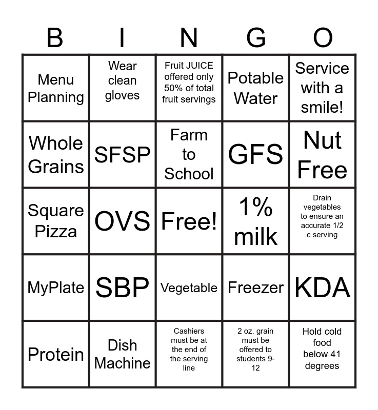 This bingo card has a free space and 49 words: Apple Juice, Wellness Plan, KYSNA, 2 oz. grain must be offered to students 9-12, Drain vegetables to ensure an accurate 1/2 c serving, Prairie Farms, Wear clean gloves, 4 components must be offered at breakfast, GFS, 5 components must be offered at lunch, Whole Grains, OVS, Freezer, Hold cold food below 41 degrees, Cooler, Offer whole grain rich food 80 % of the time for breakfast and lunch, Fruit JUICE offered only 50% of total fruit servings, 1% milk, Ala Carte items must be Smart Snack compliant, Menu Planning, Dish Machine, Cashiers must be at the end of the serving line, Potable Water, Service with a smile!, NSLP, SBP, Farm to School, KDE, KDA, MyPlate, Fruit, Vegetable, Grain, Milk, Protein, Dry Storage, red/orange, Accommodations, Nut Free, Production Record, Sodium levels, Pizza and corn, Cereal, Cinnamon Roll, Square Pizza, SFSP, Non- Congregate Feeding, CACFP and Apple Pizza.