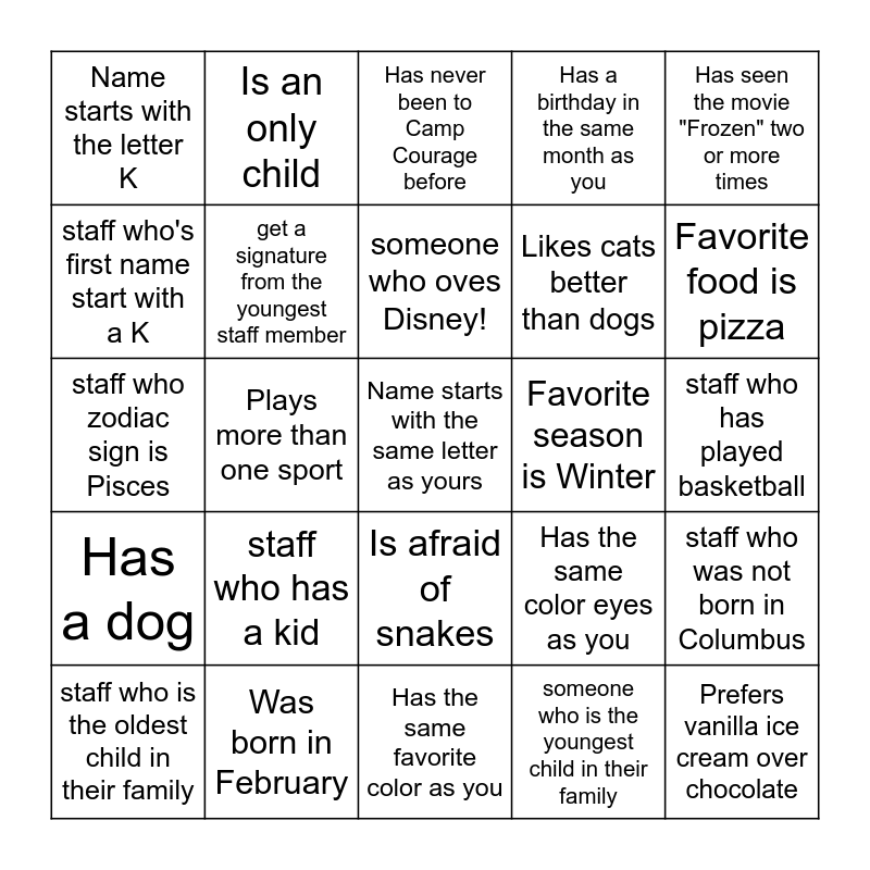 This bingo card has a free space and 24 words: staff who is the oldest child in their family, staff who has a kid, someone who oves Disney!, someone who is the youngest child in their family, Has seen the movie "Frozen" two or more times, Name starts with the letter K, Is an only child, Has never been to Camp Courage before, Favorite season is Winter, staff who has played basketball, staff who zodiac sign is Pisces, get a signature from the youngest staff member, Has the same color eyes as you, staff who was not born in Columbus, staff who's first name start with a K, Was born in February, Has the same favorite color as you, Has a birthday in the same month as you, Favorite food is pizza, Has a dog, Plays more than one sport, Is afraid of snakes, Likes cats better than dogs and Prefers vanilla ice cream over chocolate.