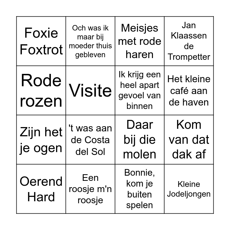 This bingo card has 33 words: Twee motten, Ome Jan, Kom van dat dak af, Met de vlam in de pijp, Kleine Jodeljongen, Ik krijg een heel apart gevoel van binnen, Rode rozen, Alle duiven op de Dam, Och was ik maar bij moeder thuis gebleven, Daar bij de waterkant, Het kleine café aan de haven, Meisjes met rode haren, Mexico, Uche uche uche, Een roosje m'n roosje, 't was aan de Costa del Sol, Koffie koffie, Daar bij die molen, Carolientje, Vogeltje wat zing je vroeg, Brandend Zand, Bij ons in de Jordaan, Foxie Foxtrot, Bonnie, kom je buiten spelen, Willem, Oerend Hard, Jan Klaassen de Trompetter, Zijn het je ogen, Visite, De liefde van de man gaat door de maag, Big City, Malle Babbe and Ik zie een ster.