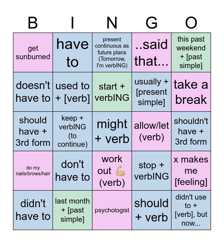 This bingo card has a free space and 24 words: don't have to, last month + [past simple], start + verbING, didn't have to, this past weekend + [past simple], get sunburned, doesn't have to, have to, allow/let (verb), work out 💪🏼 (verb), usually + [present simple], should have + 3rd form, stop + verbING, x makes me [feeling], used to + [verb], should + verb, shouldn't have + 3rd form, present continuous as future plans (Tomorrow, I'm verbING), take a break, keep + verbING (to continue), didn't use to + [verb], but now..., do my nails/brows/hair, ..said that... and psychologist.