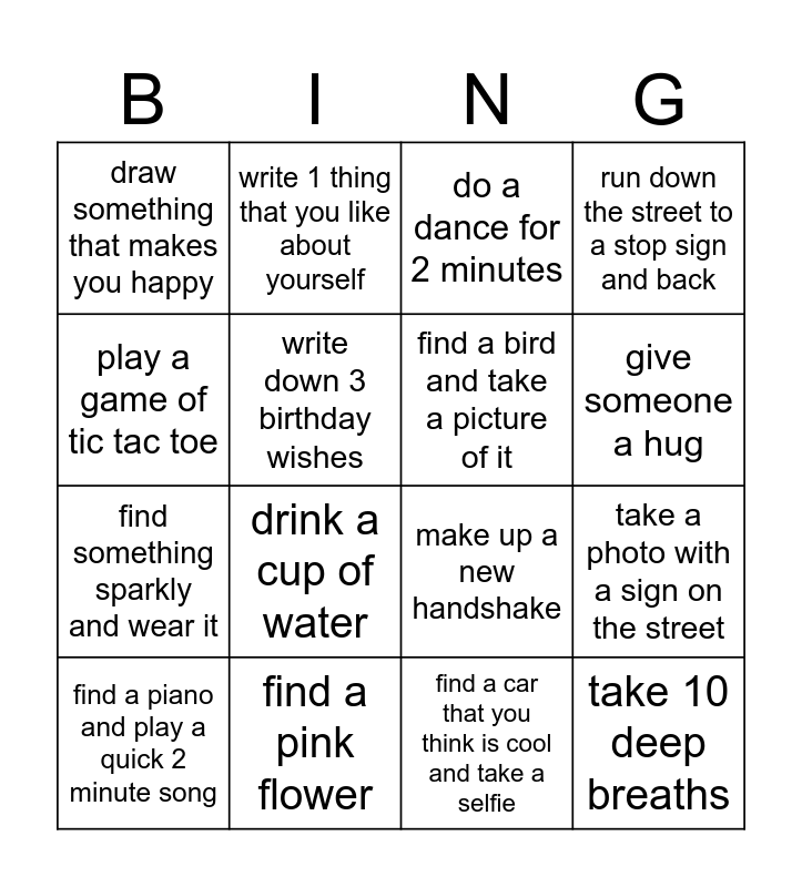 This bingo card has 16 words: find a pink flower, take a photo with a sign on the street, do a dance for 2 minutes, draw something that makes you happy, find something sparkly and wear it, write 1 thing that you like about yourself, make up a new handshake, find a car that you think is cool and take a selfie, play a game of tic tac toe, write down 3 birthday wishes, find a piano and play a quick 2 minute song, run down the street to a stop sign and back, drink a cup of water, give someone a hug, find a bird and take a picture of it and take 10 deep breaths.