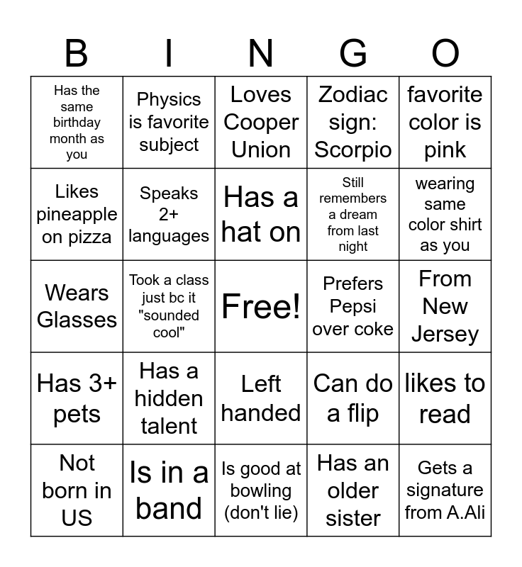 This bingo card has a free space and 24 words: Has a hidden talent, Is in a band, Has a hat on, Not born in US, favorite color is pink, Has the same birthday month as you, Likes pineapple on pizza, Physics is favorite subject, Prefers Pepsi over coke, Left handed, Still remembers a dream from last night, Wears Glasses, Can do a flip, likes to read, Speaks 2+ languages, Has an older sister, From New Jersey, Loves Cooper Union, wearing same color shirt as you, Took a class just bc it "sounded cool", Gets a signature from A.Ali, Has 3+ pets, Zodiac sign: Scorpio and Is good at bowling (don't lie).