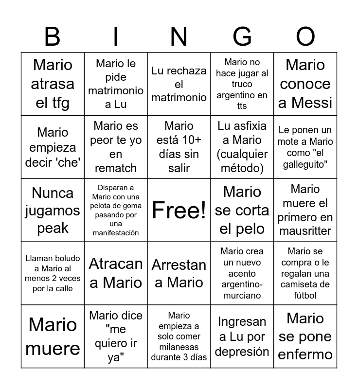 This bingo card has a free space and 24 words: Mario muere, Atracan a Mario, Mario está 10+ días sin salir, Ingresan a Lu por depresión, Mario conoce a Messi, Mario atrasa el tfg, Mario le pide matrimonio a Lu, Lu rechaza el matrimonio, Mario se corta el pelo, Mario muere el primero en mausritter, Nunca jugamos peak, Mario es peor te yo en rematch, Mario crea un nuevo acento argentino-murciano, Mario se compra o le regalan una camiseta de fútbol, Mario empieza decir 'che', Mario dice "me quiero ir ya", Mario empieza a solo comer milanesas durante 3 días, Mario no hace jugar al truco argentino en tts, Le ponen un mote a Mario como "el galleguito", Llaman boludo a Mario al menos 2 veces por la calle, Disparan a Mario con una pelota de goma pasando por una manifestación, Arrestan a Mario, Lu asfixia a Mario (cualquier método) and Mario se pone enfermo.