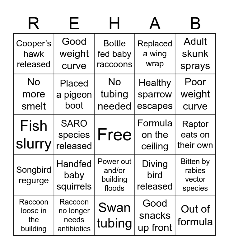 This bingo card has a free space and 24 words: Raccoon loose in the building, Handfed baby squirrels, No tubing needed, Good snacks up front, Adult skunk sprays, Cooper’s hawk released, Good weight curve, Bottle fed baby raccoons, Formula on the ceiling, Raptor eats on their own, Fish slurry, Placed a pigeon boot, Diving bird released, Bitten by rabies vector species, No more smelt, Raccoon no longer needs antibiotics, Swan tubing, Replaced a wing wrap, Poor weight curve, Songbird regurge, SARO species released, Power out and/or building floods, Healthy sparrow escapes and Out of formula.