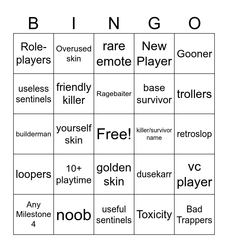 This bingo card has a free space and 24 words: Any Milestone 4, 10+ playtime, Ragebaiter, Toxicity, Gooner, Role-players, Overused skin, rare emote, killer/survivor name, retroslop, builderman, friendly killer, dusekarr, vc player, useless sentinels, noob, useful sentinels, New Player, trollers, loopers, yourself skin, golden skin, base survivor and Bad Trappers.