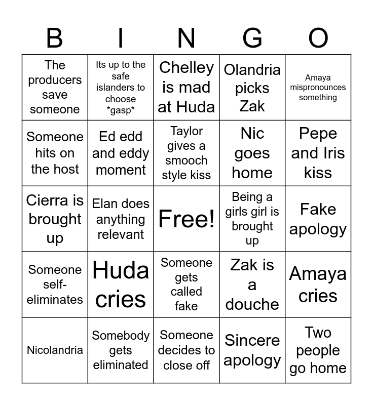 This bingo card has a free space and 24 words: Huda cries, Somebody gets eliminated, Taylor gives a smooch style kiss, Nicolandria, Amaya mispronounces something, The producers save someone, Someone hits on the host, Its up to the safe islanders to choose *gasp*, Being a girls girl is brought up, Someone gets called fake, Nic goes home, Cierra is brought up, Zak is a douche, Amaya cries, Ed edd and eddy moment, Sincere apology, Fake apology, Chelley is mad at Huda, Pepe and Iris kiss, Elan does anything relevant, Two people go home, Someone self-eliminates, Olandria picks Zak and Someone decides to close off.