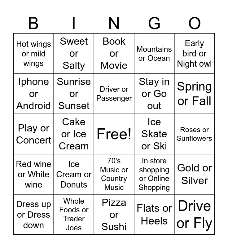This bingo card has a free space and 36 words: Dog or Cat, Tea or Coffee, Starbucks or Dunkin, Sunrise or Sunset, In store shopping or Online Shopping, Red wine or White wine, Driver or Passenger, Run or Walk, Early bird or Night owl, Cook or Bake, Cake or Ice Cream, Mountains or Ocean, Grapes or Strawberries, Ice Skate or Ski, Spring or Fall, Hot wings or mild wings, Orange Theory or Hot Yoga, Ice Cream or Donuts, Drive or Fly, Book or Movie, Roses or Sunflowers, Gold or Silver, Whole Foods or Trader Joes, Dress up or Dress down, Pizza or Sushi, Sweet or Salty, Play or Concert, Scary Movie or Romance, Stay in or Go out, Iphone or Android, Morristown or Montclair, Talk or Listen, Flats or Heels, 70's Music or Country Music, Window Seat or Isle seat and Waffles or Pancakes.