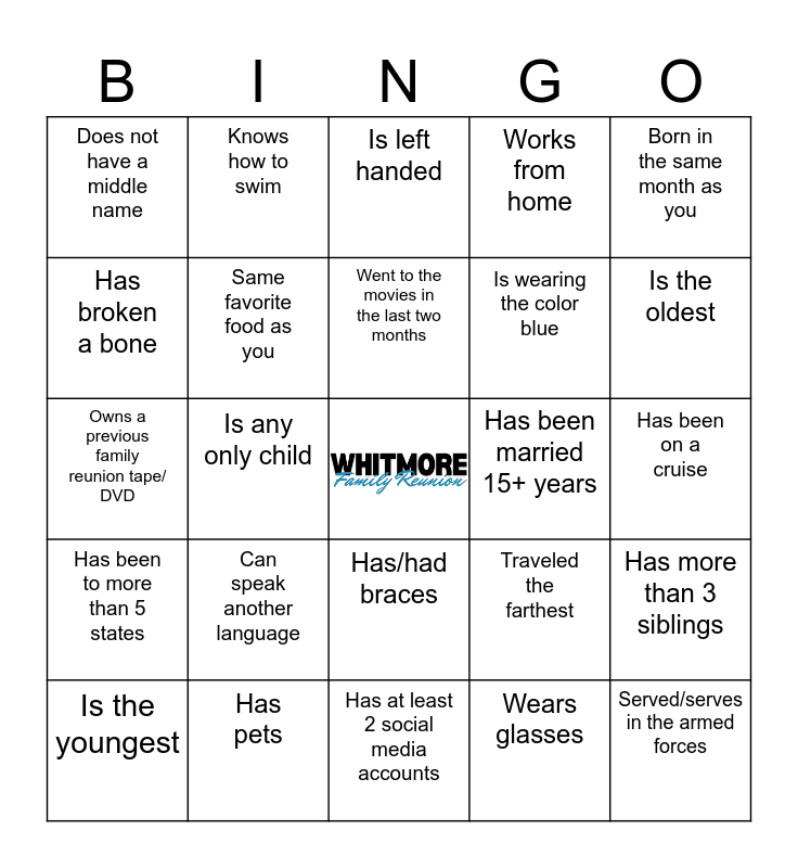 This bingo card has a free space and 24 words: Is the youngest, Can speak another language, Went to the movies in the last two months, Wears glasses, Born in the same month as you, Does not have a middle name, Knows how to swim, Is left handed, Has been married 15+ years, Has been on a cruise, Owns a previous family reunion tape/ DVD, Same favorite food as you, Traveled the farthest, Has more than 3 siblings, Has broken a bone, Has pets, Has at least 2 social media accounts, Works from home, Is the oldest, Has been to more than 5 states, Is any only child, Has/had braces, Is wearing the color blue and Served/serves in the armed forces.