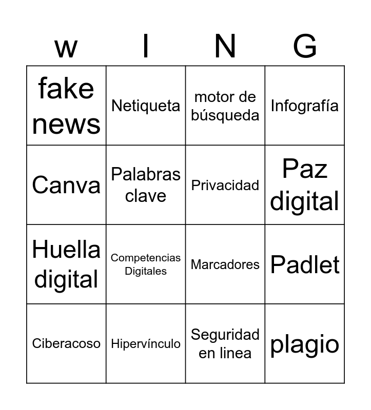 This bingo card has 18 words: Competencias Digitales, plagio, motor de búsqueda, fake news, Marcadores, Infografía, Ciberacoso, Netiqueta, Paz digital, Huella digital, Seguridad en linea, Canva, Padlet, Palabras clave, Privacidad, cookies, Hipervínculo and contraseña.