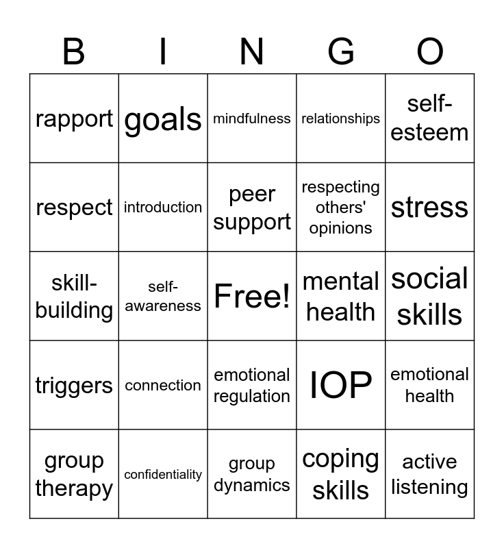 This bingo card has a free space and 24 words: group therapy, connection, peer support, coping skills, self-esteem, rapport, goals, mindfulness, mental health, social skills, skill-building, introduction, IOP, emotional health, respect, confidentiality, group dynamics, relationships, stress, triggers, self-awareness, emotional regulation, respecting others' opinions and active listening.