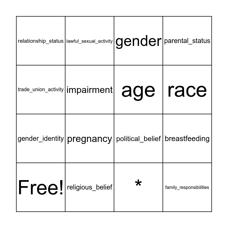 This bingo card has 17 words: *, Free!, gender, relationship_status, pregnancy, parental_status, breastfeeding, age, race, impairment, religious_belief, political_belief, trade_union_activity, lawful_sexual_activity, gender_identity, sexuality and family_responsibilities.