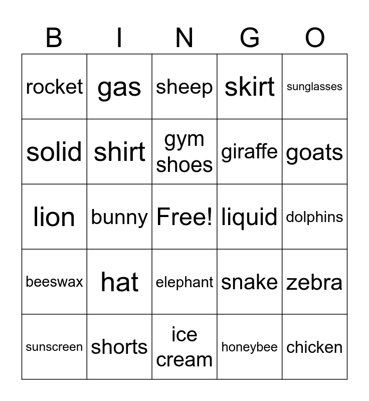 This bingo card has a free space and 24 words: hat, shorts, gym shoes, sunscreen, sunglasses, rocket, solid, gas, liquid, elephant, giraffe, lion, snake, zebra, shirt, honeybee, dolphins, sheep, goats, bunny, chicken, beeswax, skirt and ice cream.