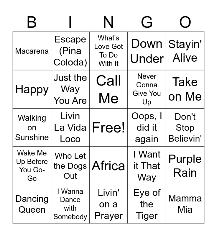 This bingo card has a free space and 29 words: Dancing Queen, The Final Countdown, Livin La Vida Loco, Girls Just Want to Have Fun, Macarena, What's Love Got To Do With It, Just the Way You Are, Who Let the Dogs Out, Oops, I did it again, I Wanna Dance with Somebody, Don't Stop Believin', Mamma Mia, Livin' on a Prayer, Eye of the Tiger, Take on Me, What is Love, Africa, Wake Me Up Before You Go-Go, Stayin' Alive, Walking on Sunshine, I Want it That Way, I Will Always Love You, Never Gonna Give You Up, Happy, Down Under, Escape (Pina Coloda), Purple Rain, Call Me and Wanna Be.