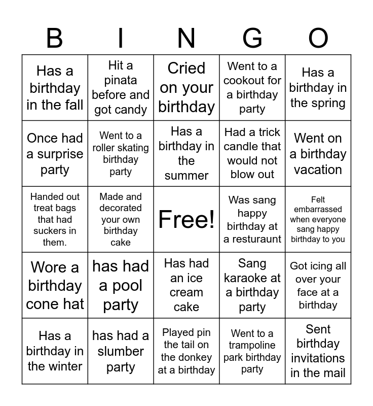 This bingo card has a free space and 24 words: has had a pool party, has had a slumber party, Has a birthday in the summer, Has a birthday in the winter, Has a birthday in the spring, Has a birthday in the fall, Once had a surprise party, Hit a pinata before and got candy, Was sang happy birthday at a resturaunt, Has had an ice cream cake, Had a trick candle that would not blow out, Handed out treat bags that had suckers in them., Sang karaoke at a birthday party, Got icing all over your face at a birthday, Went to a roller skating birthday party, Went to a trampoline park birthday party, Felt embarrassed when everyone sang happy birthday to you, Cried on your birthday, Went on a birthday vacation, Made and decorated your own birthday cake, Sent birthday invitations in the mail, Wore a birthday cone hat, Went to a cookout for a birthday party and Played pin the tail on the donkey at a birthday.
