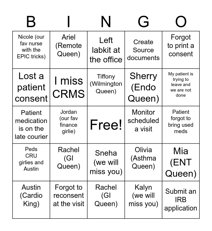 This bingo card has a free space and 46 words: Alyson (PICU Queen), Submit an IRB application, Spun Samples at at wrong temp, Rachel (GI Queen), Rachel (GI Queen), patient never showed up, Ariel (Remote Queen), Sponsor declined early IRT, Lost a patient consent, Kelli (our fav regulatory girlie), I miss CRMS, Create Source documents, Mia (ENT Queen), Olivia (Asthma Queen), Behind on data entry, Ally (GI Queen), Tiffony (Wilmington Queen), Monitor scheduled a visit, Hope (we will miss you), Forgot to print a consent, Jordan (our fav finance girlie), Kalyn (we will miss you), Nicole (our fav nurse with the EPIC tricks), Sherry (Endo Queen), Pharmacy is to far away, My patient is trying to leave and we are not done, Austin (Cardio King), EPIC does not work for monitor, Sneha (we will miss you), Peds CRU girlies and Austin, Miriam (our fav director girlie), Colleen (our fav admin girlie), Oncore (not impressed), Carolina (Rheum Queen), Tejanah (Asthma Queen), Forgot to reconsent at the visit, Patient forgot to bring used meds, Corinne (Pulm Queen), Katie (our fav associate director), Abby (Premise Queen), Joe Baker is our supervisor on EPIC (apparently), Left labkit at the office, Patient medication is on the late courier, Makes mistake on source doc(initial and date), Patient arrived late and Schedule a patient visit.
